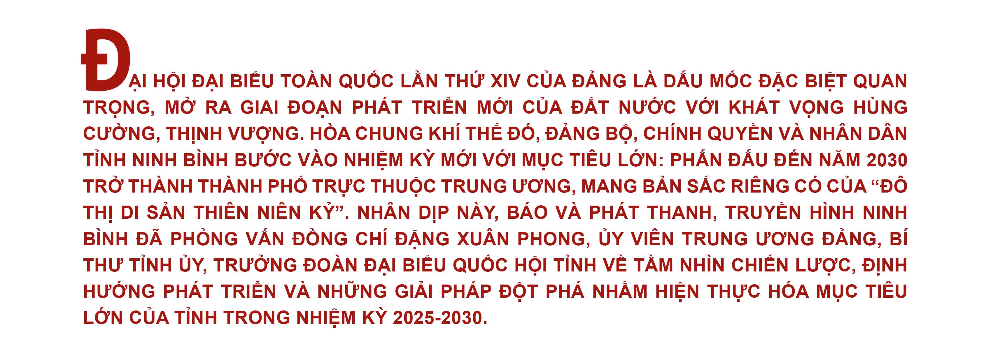 Phóng viên: Thưa đồng chí Bí thư Tỉnh ủy, trong bối cảnh cả nước đang đặt niềm tin và kỳ vọng về những quyết sách phát triển đất nước của Đại hội XIV của Đảng, Ninh Bình xác định mục tiêu lớn nào cho nhiệm kỳ mới? Đồng chí Bí thư Tỉnh ủy Đặng Xuân Phong: Đại hội XIV của Đảng diễn ra trong bối cảnh đất nước bước vào giai đoạn phát triển mới, với yêu cầu ngày càng cao về chất lượng tăng trưởng, phát triển bền vững và nâng cao đời sống Nhân dân. Quán triệt sâu sắc tinh thần đó, Đảng bộ tỉnh Ninh Bình xác định mục tiêu tổng quát trong nhiệm kỳ 2025-2030 đó là, phát huy tiềm năng, lợi thế, nguồn lực, động lực, tăng tốc bứt phá theo mô hình tăng trưởng mới; phấn đấu đến năm 2030, Ninh Bình trở thành thành phố trực thuộc Trung ương, có công nghiệp hiện đại, dịch vụ, du lịch chất lượng cao, đô thị xanh gắn với di sản, nằm trong nhóm các địa phương dẫn đầu cả nước về tốc độ tăng trưởng, thu nhập bình quân đầu người. Xác lập vị thế, vai trò của trung tâm du lịch quốc gia, quốc tế; trung tâm đào tạo nguồn nhân lực chất lượng cao; trung tâm y tế và chăm sóc sức khỏe; trung tâm công nghiệp công nghệ cao của liên vùng và đất nước với trụ cột là cơ khí ô tô, công nghệ thông tin, công nghiệp điện tử, chế biến, chế tạo, công nghiệp năng lượng, vật liệu xanh. Kết hợp hài hòa giữa bảo tồn di sản văn hóa, bảo vệ môi trường với tăng trưởng kinh tế, chuyển đổi xanh, chuyển đổi số. Xây dựng tiềm lực quốc phòng địa phương và khu vực phòng thủ tỉnh vững chắc, bảo đảm an ninh chính trị, trật tự, an toàn xã hội. Xây dựng Đảng và hệ thống chính trị trong sạch, vững mạnh toàn diện, kinh tế phát triển, xã hội phồn vinh, Nhân dân hạnh phúc, bản sắc văn hóa địa phương được gìn giữ và phát huy. Đây không chỉ là những mục tiêu, chỉ tiêu phát triển cụ thể, mà còn thể hiện tầm nhìn chiến lược, khát vọng vươn lên mạnh mẽ của Đảng bộ, Chính quyền và Nhân dân tỉnh Ninh Bình, đóng góp xứng đáng vào sự phát triển chung của vùng Đồng bằng Sông Hồng và cả nước. Cùng với đó, Ninh Bình xác định rõ bảo tồn và phát triển là hai mục tiêu có mối quan hệ biện chứng, gắn bó chặt chẽ với nhau. Bảo tồn là để phát triển bền vững, còn phát triển chính là tạo thêm nguồn lực và điều kiện tốt hơn cho công tác bảo tồn. Xuất phát từ đặc trưng riêng có của địa phương, Ninh Bình lựa chọn con đường phát triển dựa trên nền tảng bảo tồn di sản, coi đây là lợi thế so sánh nổi trội để hiện thực hóa mục tiêu trở thành thành phố trực thuộc Trung ương trước năm 2030. Trên cơ sở đó, tỉnh định vị sự cân bằng giữa bảo tồn và phát triển ở ba khía cạnh trọng tâm: |
