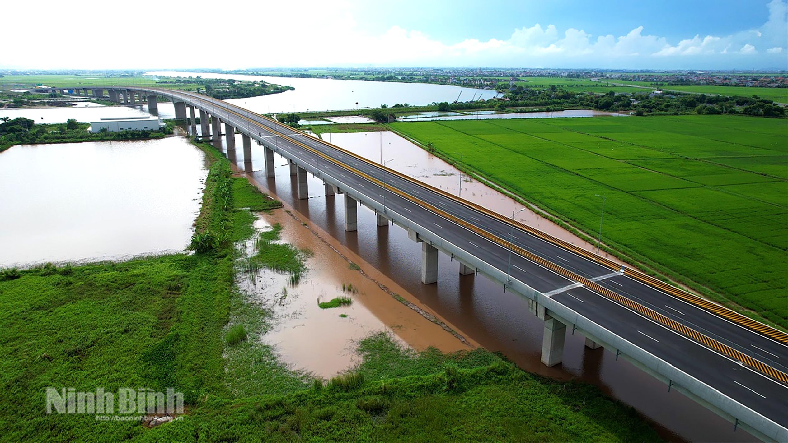 Cầu vượt sông Đáy hạng mục quan trọng, góp phần hoàn thiện tuyến đường bộ ven biển theo quy hoạch, hạ tầng giao thông trong khu vực, tạo điều kiện phát triển kinh tế - xã hội liên vùng. Ảnh Đức Huy