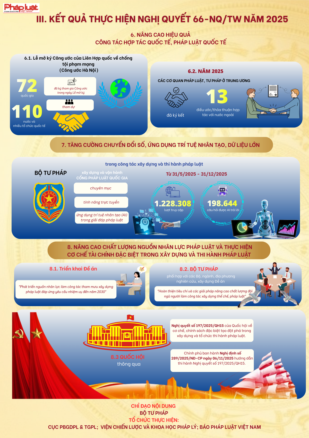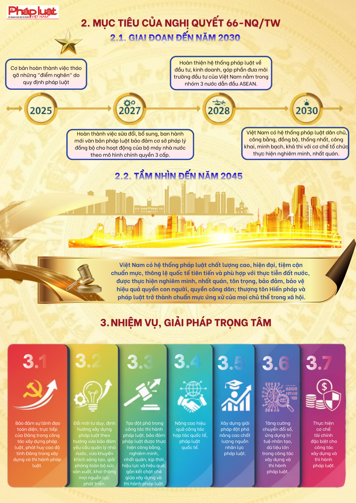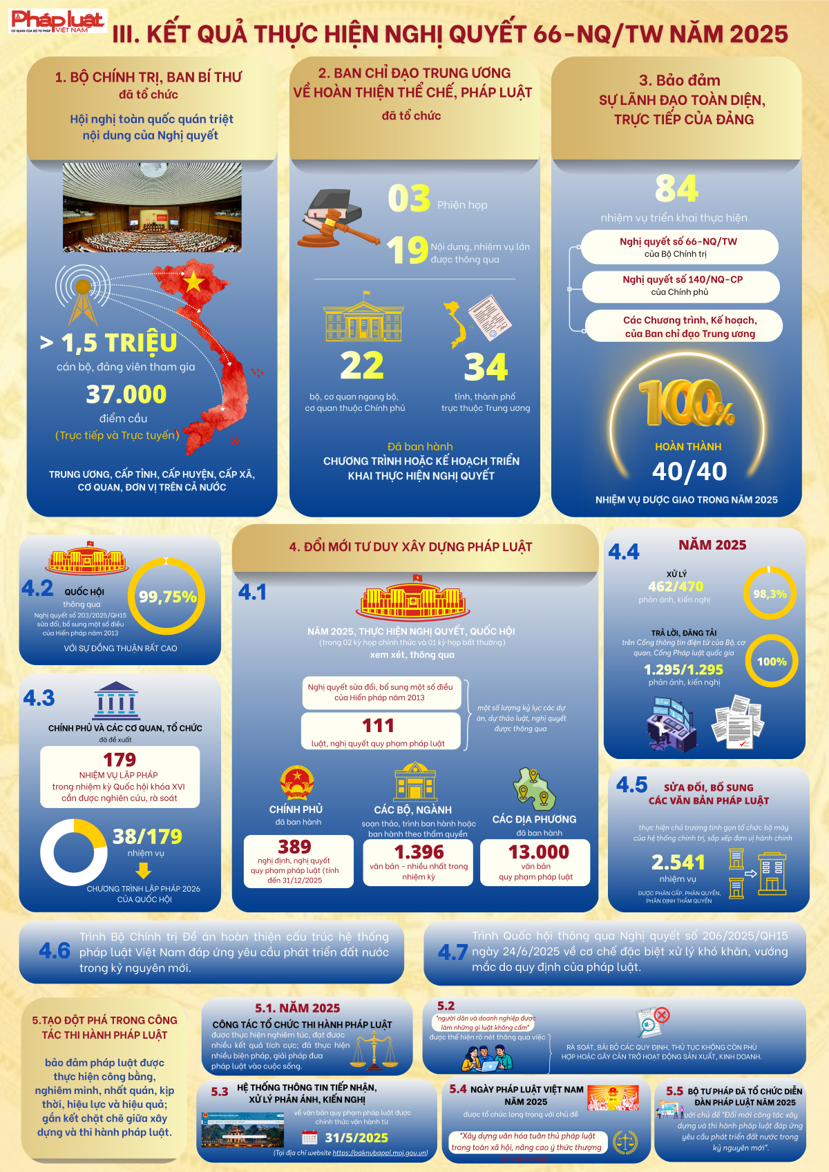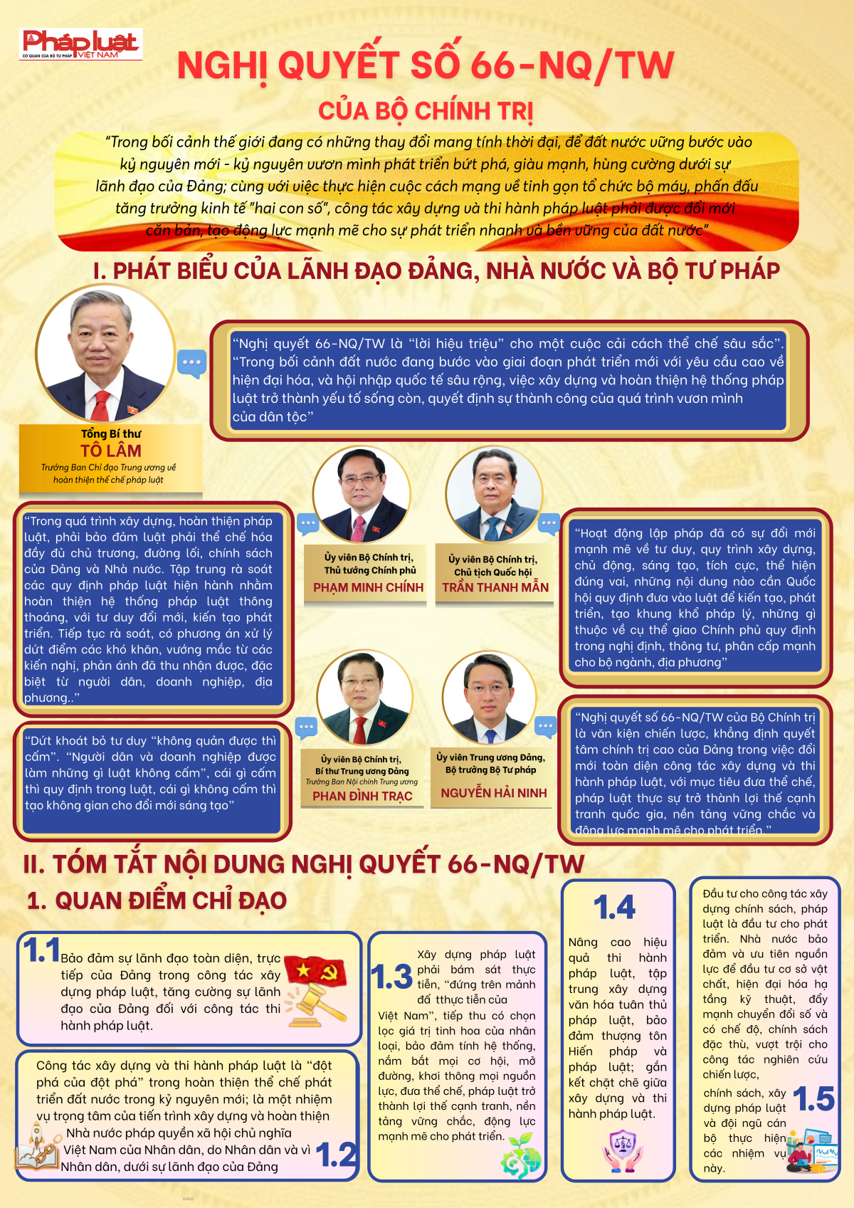 "Trong bối cảnh thế giới đang có những thay đổi mang tính thời đại, để đất nước vững bước vào kỷ nguyên mới - kỷ nguyên vươn mình phát triển bứt phá, giàu mạnh, hùng cường dưới sự lãnh đạo của Đảng; cùng với việc thực hiện cuộc cách mạng về tinh gọn tổ chức bộ máy, phấn đấu tăng trưởng kinh tế "hai con số", công tác xây dựng và thi hành pháp luật phải được đổi mới căn bản, tạo động lực mạnh mẽ cho sự phát triển nhanh và bền vững của đất nước"...